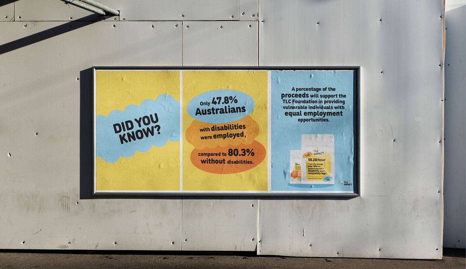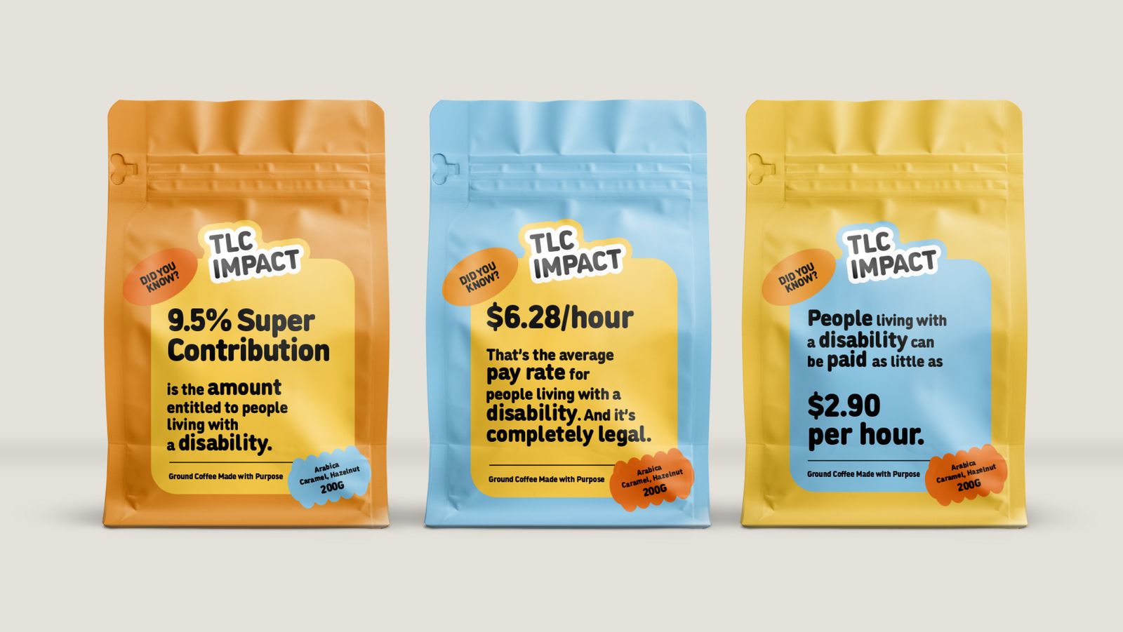 When TLC Impact approached us with a project that would empower people living with a disability through meaningful work and equal pay opportunities, we knew we wanted to make a statement with our designs. By taking a simple coffee bag and turning it into a conversation starter, we helped TLC Impact highlight the issue at hand and give a voice to those living with a disability. With bold graphic elements and eye-catching text, we honoured the incredible people behind the process while attracting consumers to the cause.